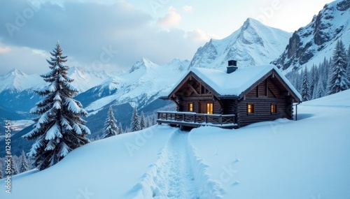 Snowy mountain hut with a sloping roof and wooden beams, alps, cold