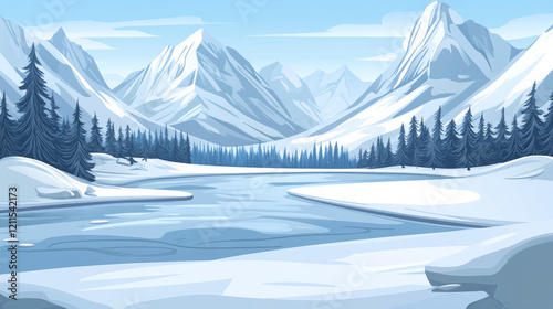 mountain, landscape, snow, glacé, lake, pine, tree, winter, cold, ice, nature, scenic, wilderness, serene, tranquil, forest, adventure, travel, exploration, majestic, peak, blue, sky, white, peaceful, remote, isolated, beauty, environment, natural, crisp, fresh, air, calm, horizon, alpine, terrain, seasonal, picturesque, illustration, art