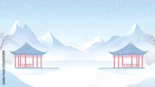 winter, snow, mountain, landscape, pavilion, chinese architecture, serene, peaceful, cold, tranquil, minimalist, art, illustration, blue, pink, white