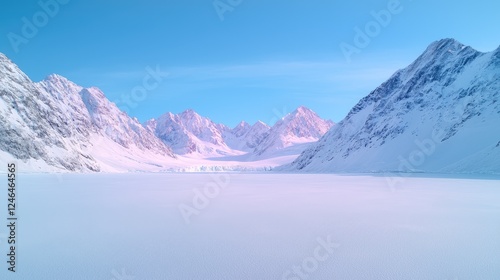 Snowy mountainscape, glacier valley, arctic landscape, serene winter scene, travel poster