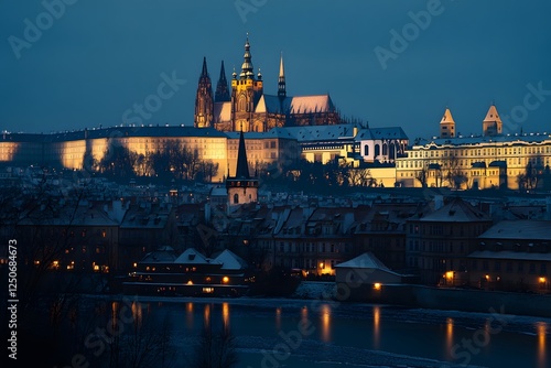 prague, castle, city landscape, river, twilight, snowy, winter, night, architecture, europa, czech, commonwealth, building, historic, old, town, travel, vacation, landmark, panorama, view, scenic, beautiful, image, photo, photo, background, wallpaper, wintery, cold, dark, light, illumination, romantic, magical, picturesque, destination, holiday, explore, discover, charming, majestic, ancient