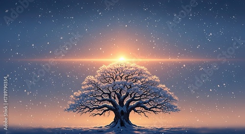 Snowy tree bathed in light, winter solstice sunrise brings renewal and tranquil beauty