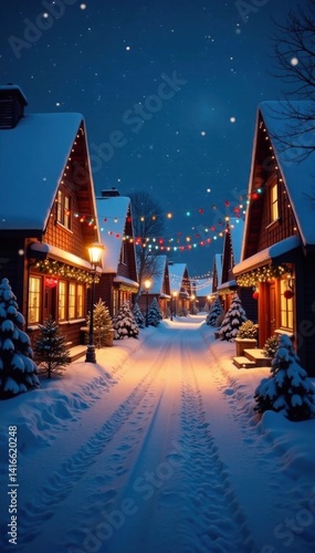 Snowy village street at night with festive lights and decorations, holiday, , Christmas