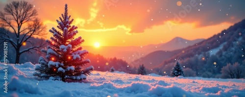 Snowy winter landscape with a festive Christmas tree background and an orange and yellow gradient at sunrise, warm light, yellow, sunset