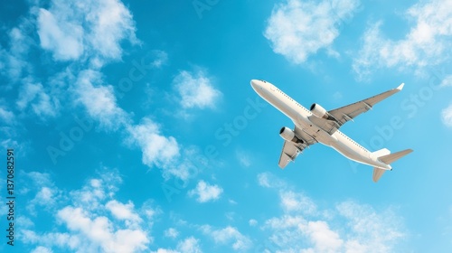 Soaring Through Skies: A modern jet airliner gracefully traverses the boundless blue canvas, beneath fluffy white clouds, evoking the spirit of travel and adventure.