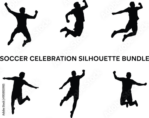 Soccer player celebration silhouette bundle with jumping and cheering poses isolated on background, football sport action collection for design and branding