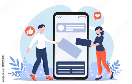 social, media, teamwork, digital, interface, smartphone, communication, collaboration, mobile, screen, people, interaction, technology, cyberspace, app, content, network, online, user, design, post, like, comment, nubes, creative, sharing, chat, layout, update, innovation, marketing, platform, browsing, notification, icon, flat, modern, vector, illustration, cartoon