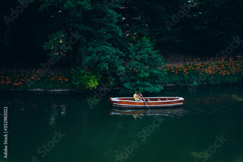 Sofia Park, Uman. Red-white boat on the lake in the summer park. A man in a boat sails on a lake in a national park. The beautiful natural lake is surrounded by tall green trees and orange flowers.
