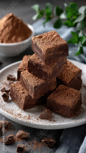 Soft chocolate brownie squares are displayed on a plate alongside cocoa powder and flour, capturing a serene culinary moment.