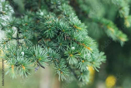 Soft focus and close-up of green spruce branches. A natural background for both design and decoration with a copy space. Natural texture of short soft spruce needles. Christmas, festive background.