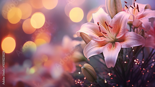Soft focus pink lily flowers with dreamy bokeh background