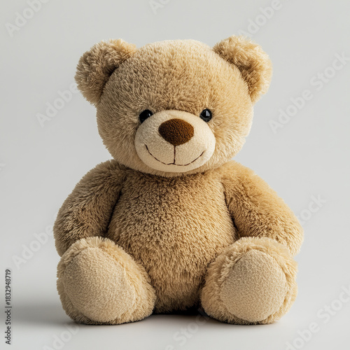 Soft light brown teddy bear with smiling face sitting on plain background, plush toy with round ears and black eyes, cozy and cute stuffed animal for children
