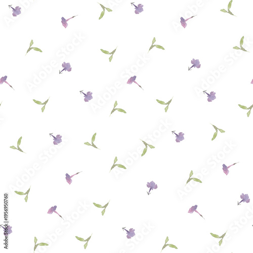 Soft meadow flower watercolor pattern on white. Seamless background with hand drawn purple blossoms green leaves. Botanical minimalist print for fabric textile, wrapping paper and stationery design.