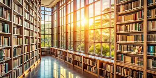 Soft natural light filtering through large windows onto neatly arranged rows of books in a serene library setting, books