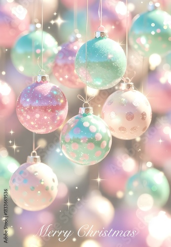 Soft pastel Christmas ornaments in pink and mint tones with glittery shine and dreamy bokeh lights. A gentle, elegant festive scene with glowing sparkles and “Merry Christmas” text.