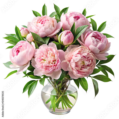 Soft Peony Bouquet: A beautiful bouquet of soft pink peony flowers, arranged gracefully in a transparent glass vase, surrounded by vibrant green leaves, exudes a sense of delicacy and elegance.