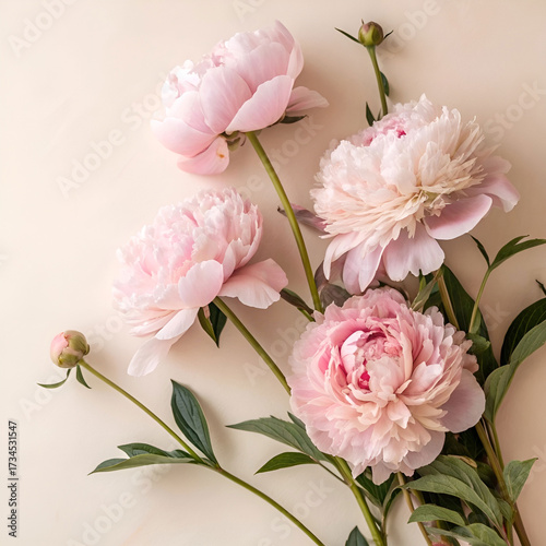 Soft pink peonies bloom gracefully against a pastel beige background.