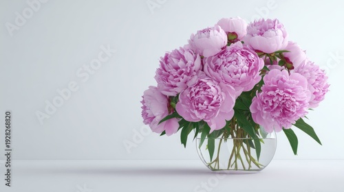 Soft pink peonies bloom in a glass vase against a plain background.