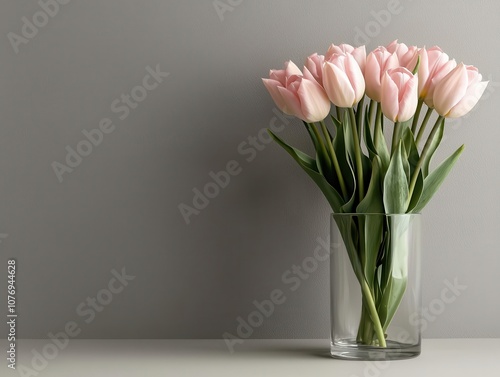 Soft pink tulips in a sleek glass vase, minimal and elegant, isolated on a neutral background