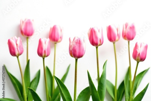 Soft pink tulips sway gently in the breeze against a crisp white background, tulip, garden