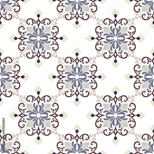 Soft red, blue, and cream damask seamless pattern illustration in traditional style - like Portuguese tiles. Graphic ornate pattern for wallpaper, tiles, porcelain, fabric, and textiles.