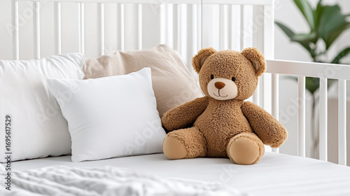 Soft teddy bear in crib, cozy bedding, inviting atmosphere, perfect for nursery