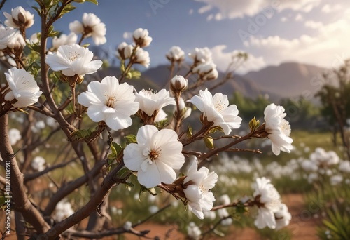 Soft white cotton flowers nestled on earthy brown branches in a field, harvest time, raw material, farm life