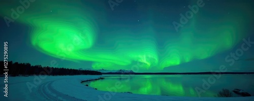 Softly glowing aurora borealis in the polar sky at night, glow, green light
