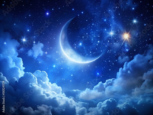 Softly glowing crescent moon surrounded by twinkling stars shines down on a serene, dreamy night sky with subtle,