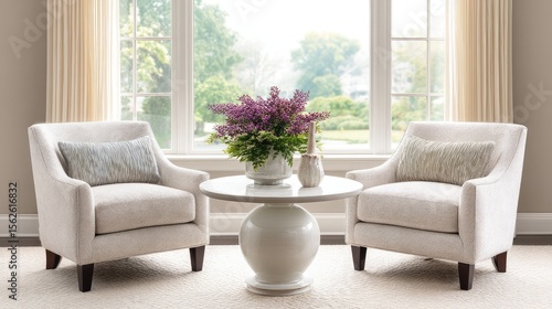 Soft-toned living room with decorative table, plush seating, and neutral background, open and calming