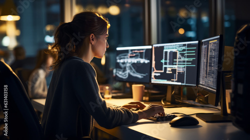 Software engineer young woman writing code on a desktop computer in an office, multiple screens, professional female