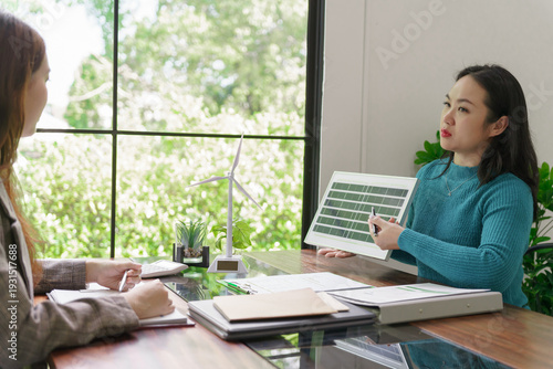 Solar panels green energy Business people working in green eco friendly office business meeting creative ideas for business eco friendly professional teaching corporate people sustainable electricity