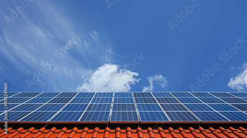 Solar panels installed on a red-tiled roof against a clear blue sky with a few clouds, capturing renewable energy from sunlight.