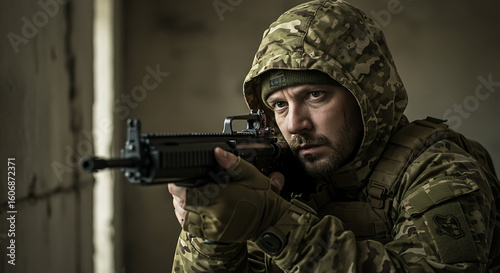 soldier, rifle, military, combat, war, camouflage, weapon, man, uniform, army, aiming, gun, hood, danger, sharpened, armed, conflict, fight, warrior, protection, defense, battle, terrorism, combatant, security, force, male, adult, beard, serious, determination, violence, crisis, power, duty, service, troop, occupation, confrontation, survival, guard, vigilance, grit, courage, strength