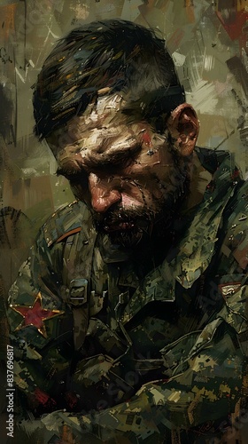 soldier, military, camouflage, portrait, painting, man, caucasian, war, battle, army, face, art, expression, sad, serious, uniform, head, eye, beard, weapon, gun, red, star, digital, illustration, colours, realistic, style