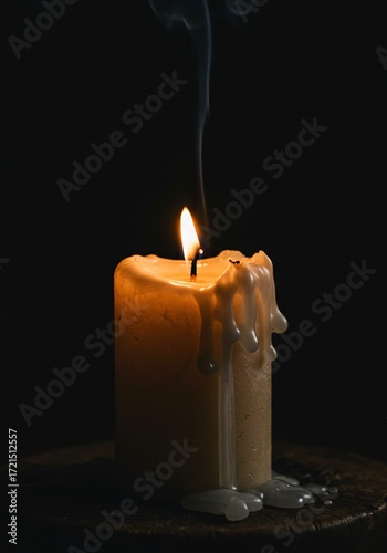Solitary candle flame illuminates the darkness with dripping wax and smoke