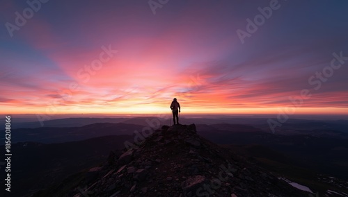 Solitary explorer stands atop a rocky summit against a vibrant twilight sky