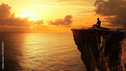 sunset, ocean, cliff, silhouette, person, figure, man, sitting, gold, horizon, sky, cloud, calm, serene, peaceful, tranquil, contemplative, solitude, alone, view, seascape, landscape, dramatic, majestic, huge, expansive, rock, edge, precipice, sea, water, light, ray, shadow, dusk, evening, day, nature, scene, beautiful, breathtaking