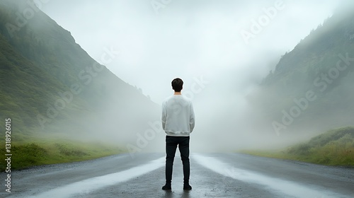 Solitary Figure Standing at the Crossroads in a Misty Mountain Landscape Surrounded by Fog and Nature