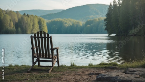 Solitary Wooden Chair by Tranquil Lake Surrounded by Lush Greenery Ideal for Reflection and Outdoor Leisure Activities