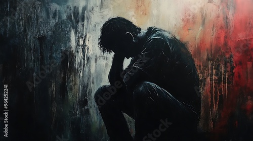 painting, silhouette, figure, solitude, despair, head, bowed, background, sombre, colours, emotional, tumult, art, canvas, dark, grey, red, black, abstract, sorrowful, loneliness, human, shadow, mood, atmosphere, gloomy, distressed, anguish, melancholy, deep, thoughtful, introspective, lost, hopeless, dejected, contemplative