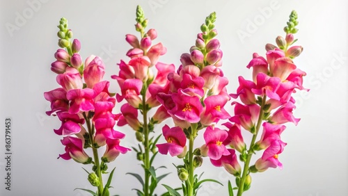 Solo delicate stem of vibrant pink snapdragon flowers stands upright against a pristine white background, exuding elegance and simplicity.