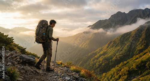 Solo hiker with backpack and poles on a mountain trail, observing a beautiful sunrise over a misty valley, embodying wilderness adventure and determination