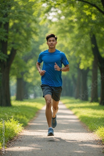 young, asian, man, running, paved, path, vibrant, green, park, blue, bright, shirt, dark, grey, short, runner, jogging, exercise, fitness, training, physical exercise, health, healthy, lifestyle, active, cardio, endurance, determination, sport, athlete, activewear, male, nature, outdoors, tree, grass, scenic, recreation, solo, energy, pace, movement, sharpened