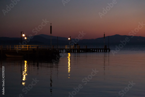 Some people on a pier at Trasimeno lake (Umbria, Italy) at dusk, with beautiful water reflections and warm colors