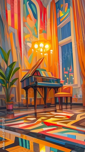 Soothing music, Melody, Calming and harmonious tunes, Drifting through a cozy room, Rainy day, 3D render, Soft spotlight, Chromatic aberration, Tracking shot view