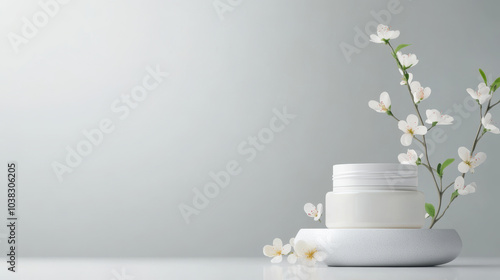 soothing skincare product is elegantly displayed alongside delicate white flowers, creating serene and calming atmosphere. This composition highlights beauty of simplicity and nature