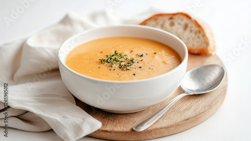 Soup bowl on wooden board with spoon and bread, showcasing a simple and delicious meal. pumpkin soup puree, diet, healthy eating, nutrition in stomach treatment