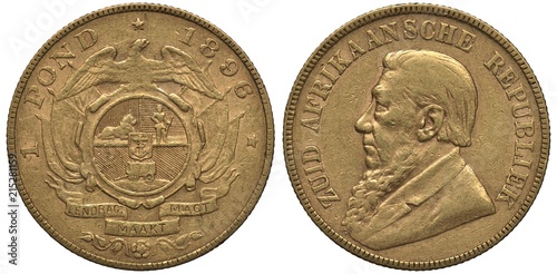 South African Republic Transvaal golden coin 1 one pound 1896, coat of arms, lion, hunter and wagon, anchor, bust of President Paul Krueger,