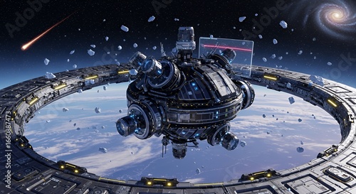 spaceship, space, station, orbit, earth, asteroid, field, cosmos, galaxy, star, planet, science, fiction, technology, future, exploration, adventure, mystery, digital, art, three-dimensional, rendering, model, design, screen, monitor, satellite, cosmic, astronomy, universe, nebula, meteor, debris, ring, structure, futuristic, stellar, celestial, dark, blue